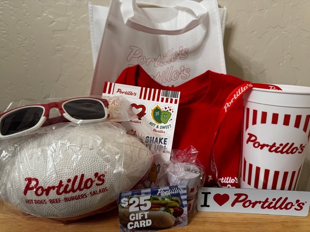 Calling all hot dog aficionados and Italian Beef devotees! This exclusive Portillo’s Merchandise Tote is the ultimate haul for fans of the iconic Chicago-style eatery. Merchandise included: Tote bag, shirt, $25 gift card, sun glasses, leash, magnet, stickers, cup, football.
